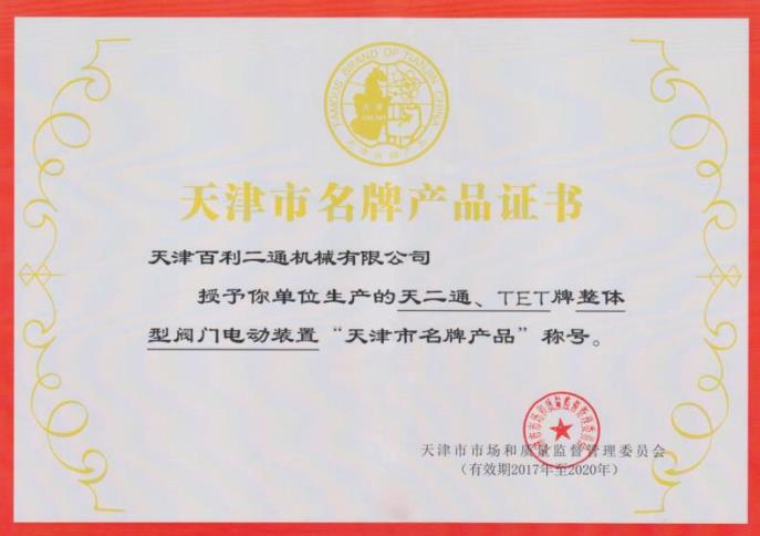 整體型閥門電動裝置名牌產品證書